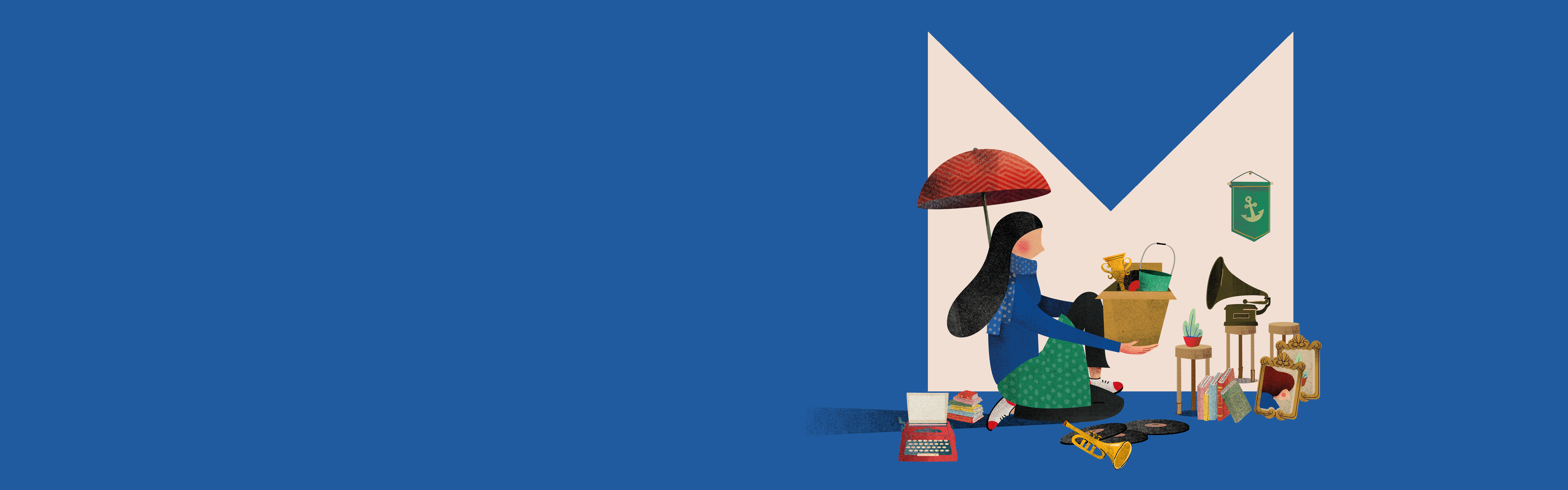 Campagnebeeld voor brochure Je kan toch niet alles bijhouden? met daarop een illustratie van een persoon met lange haren die opruimt en omringd is door allerlei spullen.