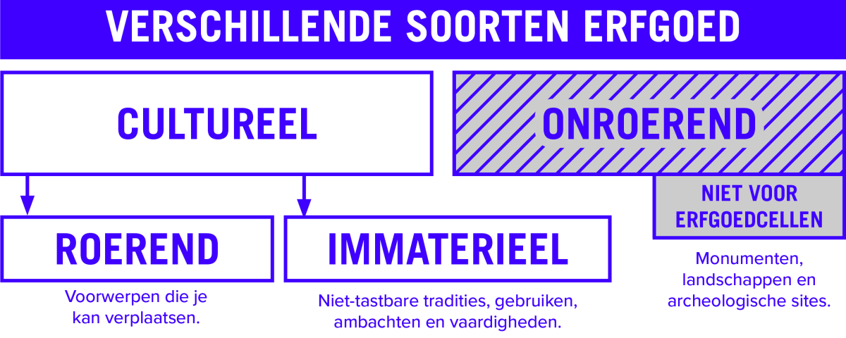 Erfgoed is veelzijdig. Het is een breed begrip dat verwijst naar alles wat van eerdere generaties is overgeleverd en wat we willen doorgeven aan toekomstige generaties omdat we er waarde aan hechten. Dit kunnen materiële zaken zijn, zoals gebouwen, kunstvoorwerpen en monumenten, maar ook immateriële dingen, zoals tradities, rituelen, verhalen, dialecten en vaardigheden.